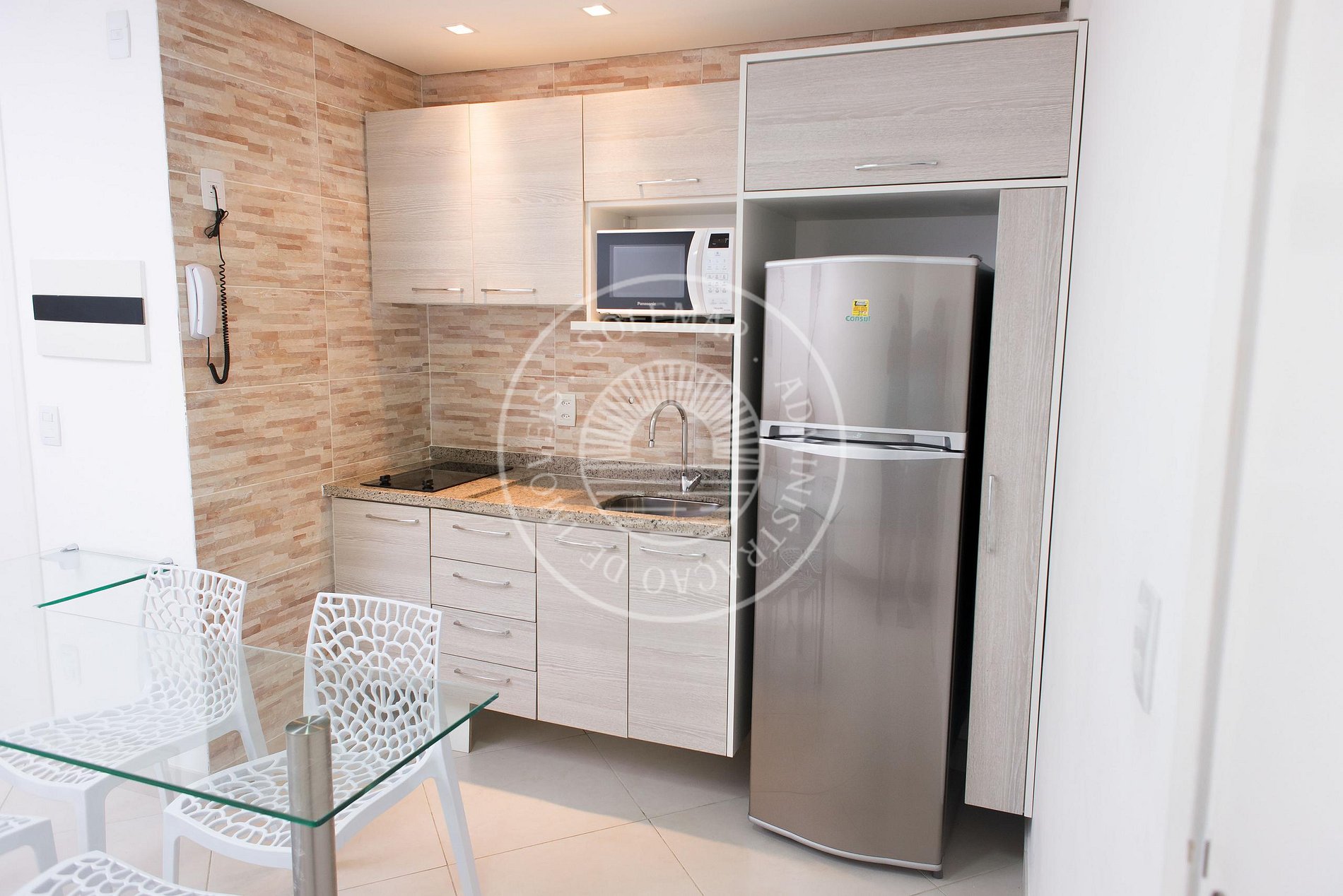 Composto da 1 suíte com guarda roupas, cama casal e Ar. Condicionado. Sala com sofá cama e TV 40” e Ar. Condicionado. Cozinha americana equipada com fogão de 2 bocas, micro-ondas, geladeira, mesa de vidro, cadeiras e utensílios básicos. O banheiro possui água quente. Varanda vista Avenida Abolição.