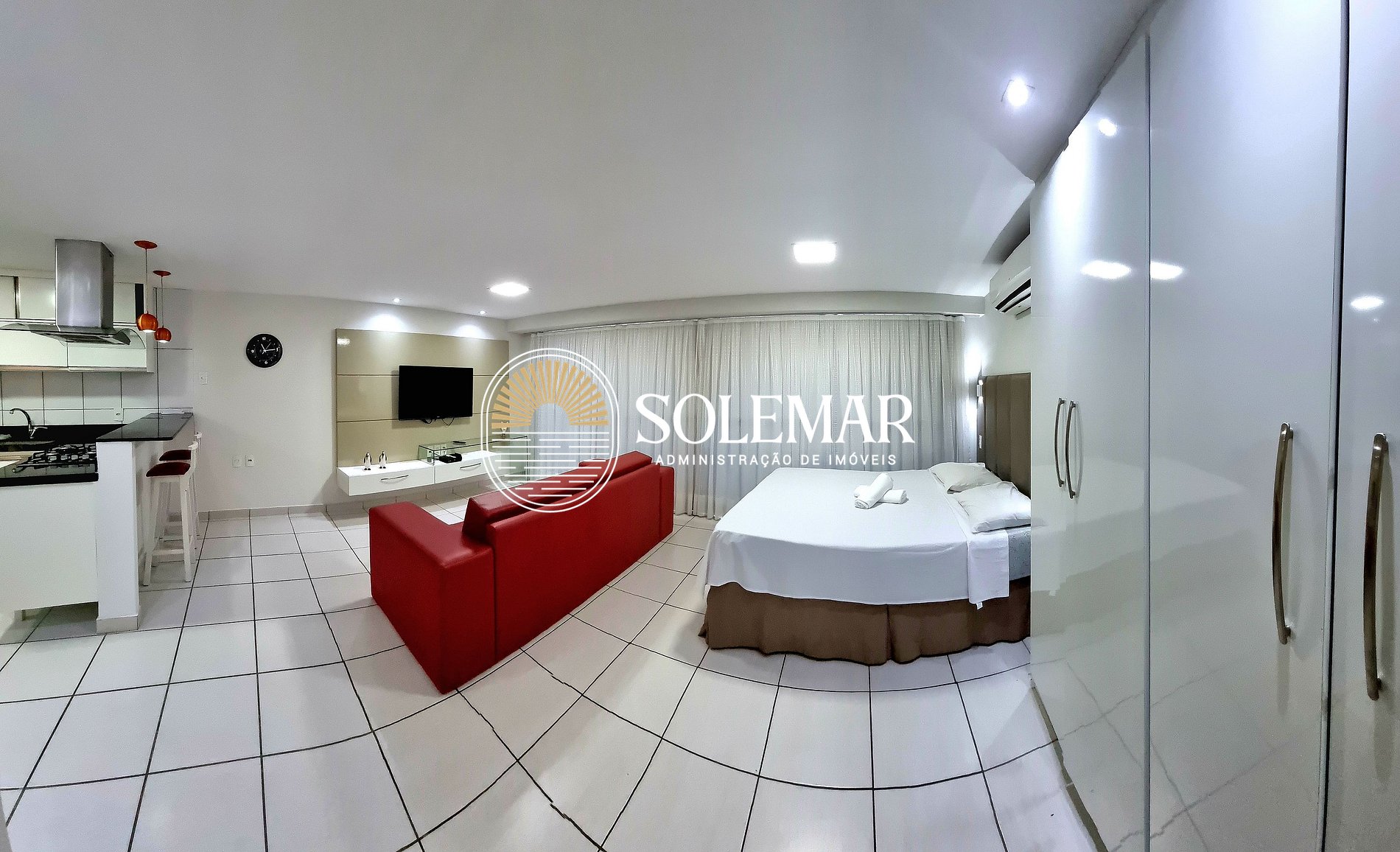 L'appartamento dispone di un ampio balcone e di un accogliente soggiorno con divano, TV e Wi-Fi. Questo spazio è integrato nella camera da letto, dotata di aria condizionata e di un comodo letto matrimoniale. Il bagno è dotato di box doccia in vetro, doccia con bidet e acqua calda per il vostro comfort. La cucina è completamente attrezzata con utensili ed elettrodomestici essenziali: tuto per farvi sentire davero a casa